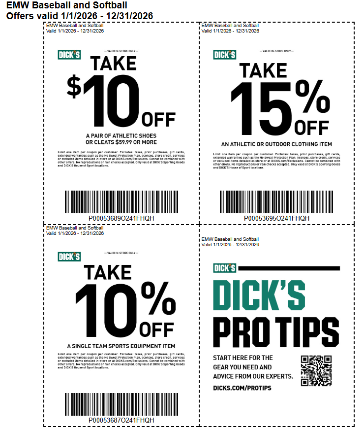 We also have coupons good throughout the year. If your kiddos need some new swag or some new gear, head on over to Dicks and save!