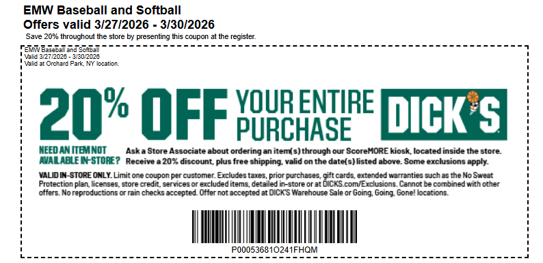 Once again, we are proud to partner with Dicks Sporting Goods for our annual Coupon Weekend. This years savings weekend will be held March 27th - 30th. Save 20% off of anything in store during that time (Valid only at the Orchard Park location)